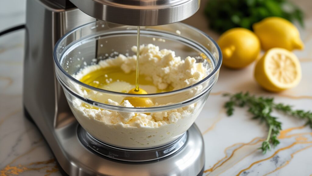 In a food processor, combine feta cheese, cream cheese, olive oil, and lemon juice. Blend until smooth and creamy.