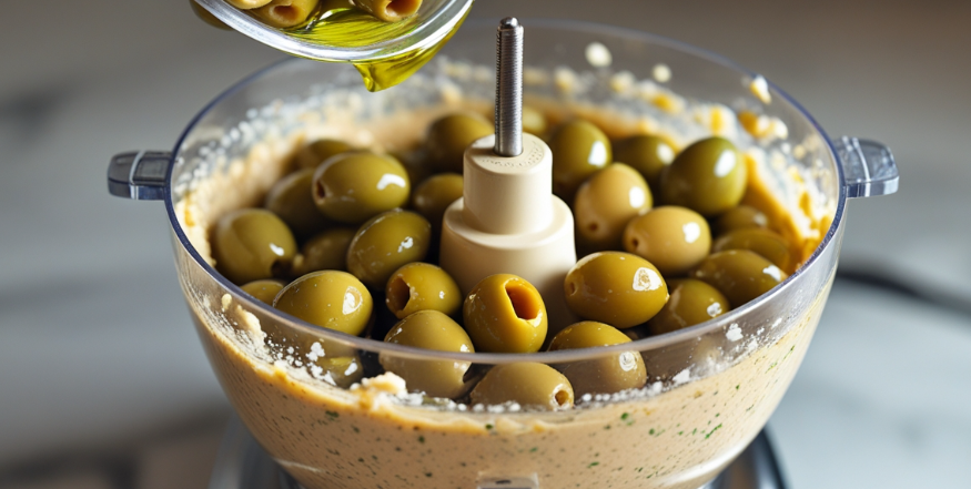 Add the green olives and garlic to the mixture. Pulse a few times to keep the texture slightly chunky for a nice bite.