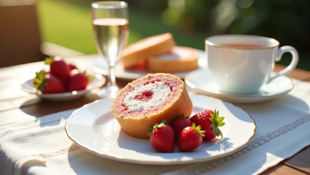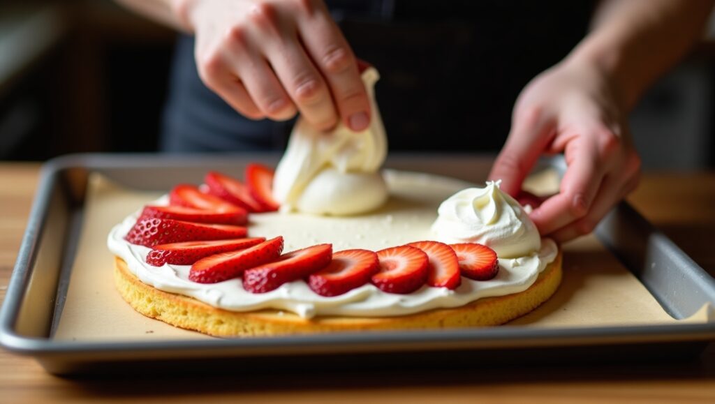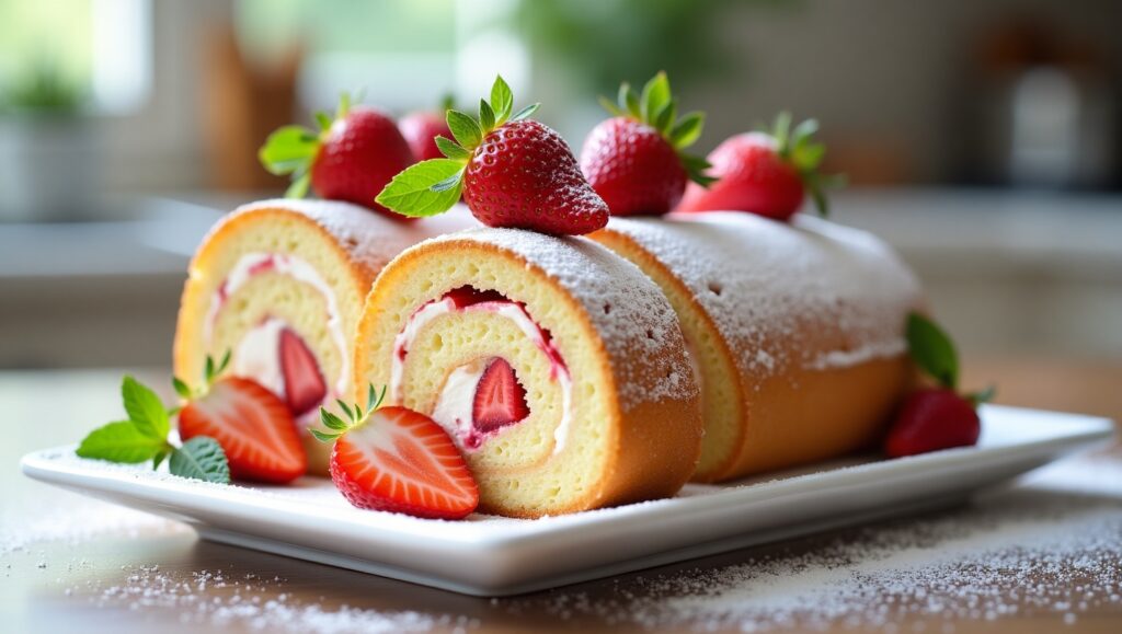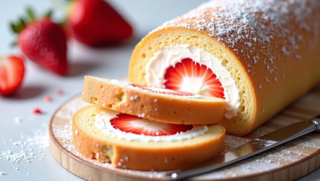 Unroll the cooled cake. Spread an even layer of whipped cream, then scatter the sliced strawberries over the cream. Carefully re-roll the sponge (without the towel) and place seam-side down on a serving platter.