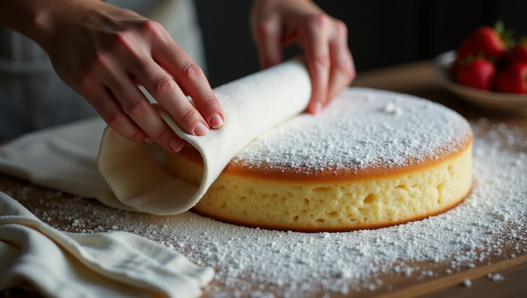 Dust the towel well with powdered sugar before rolling the cake — it creates a barrier that helps release the cake easily.