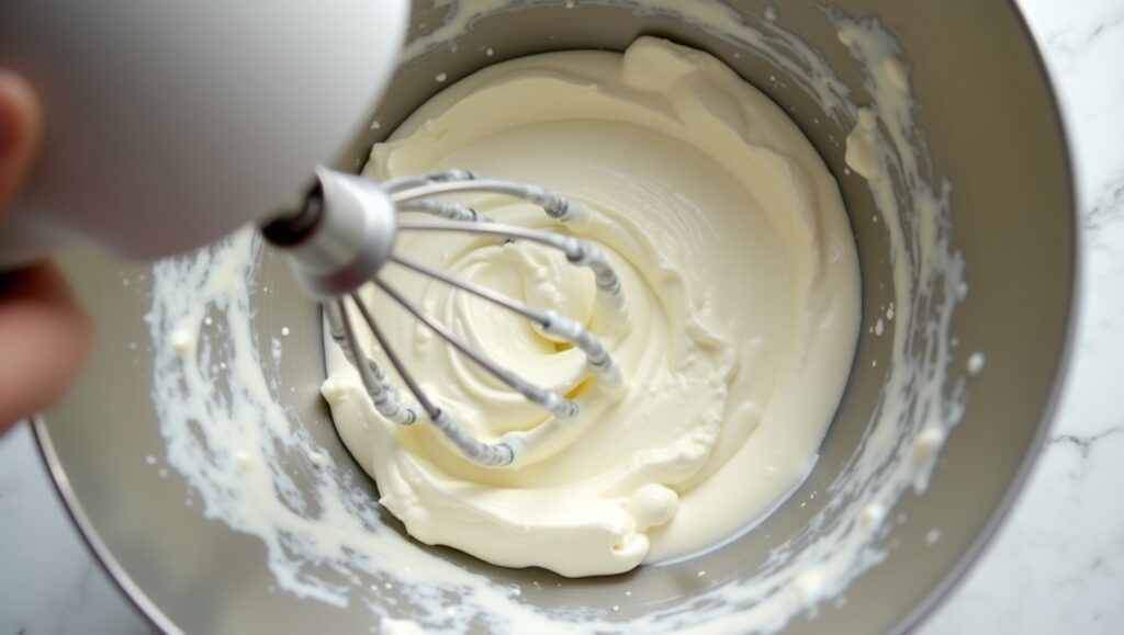 Whip the heavy cream and powdered sugar until soft peaks form. Keep the whipped cream chilled until ready to use.
